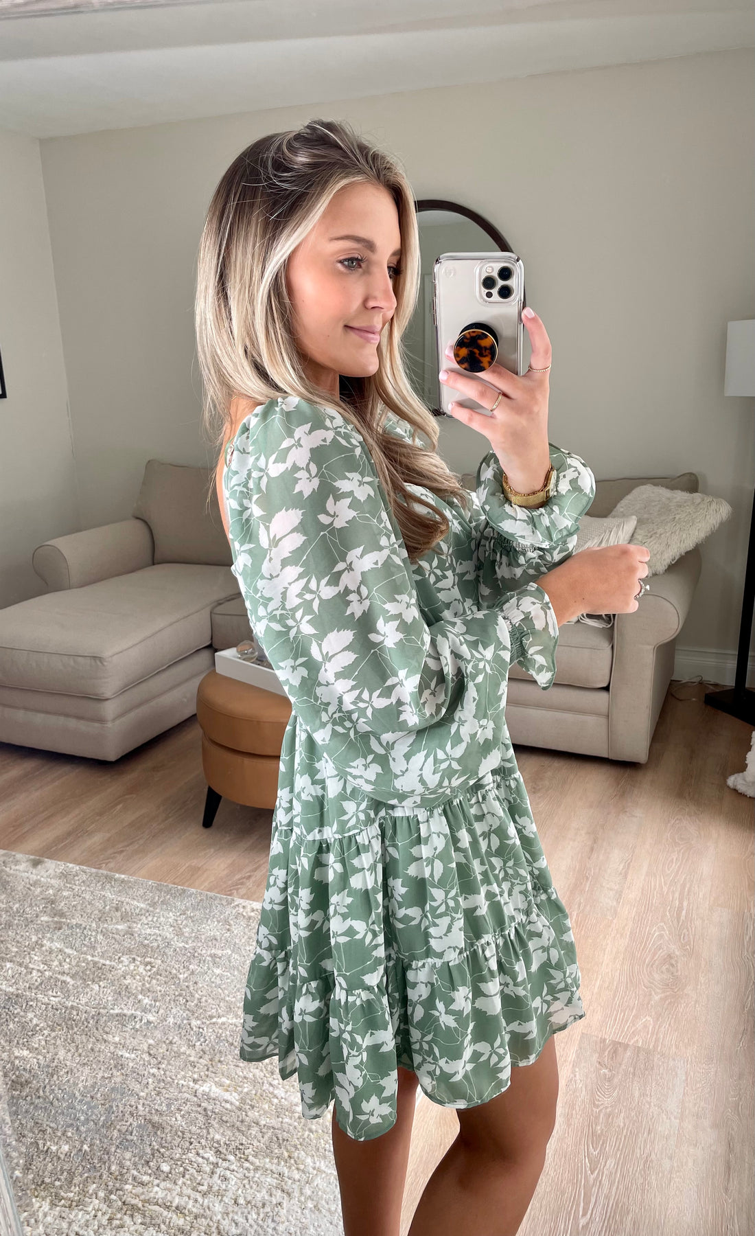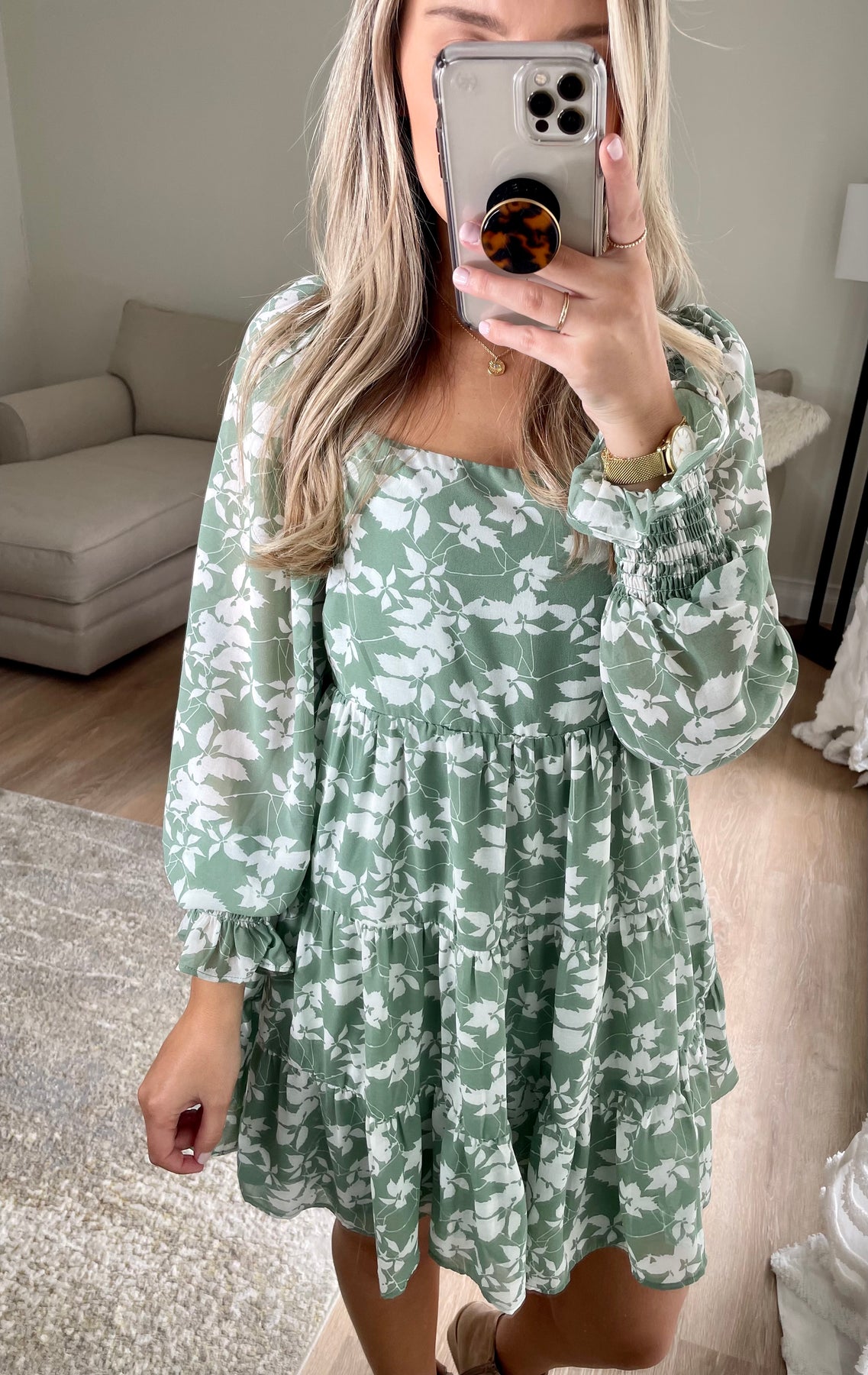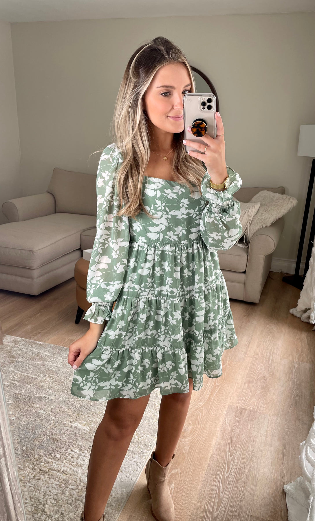 Floral print square neck dress with tiered skirt and puff sleeve with smocking detail