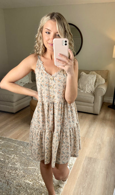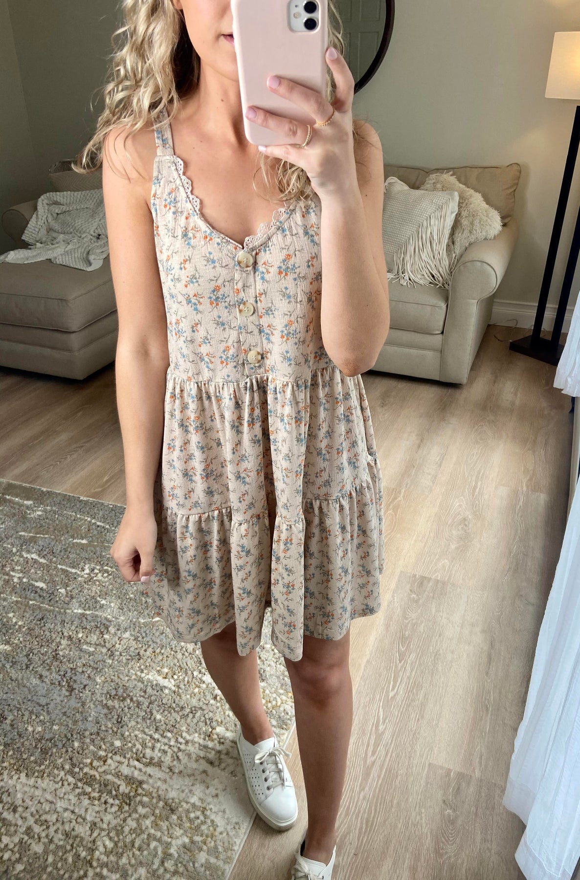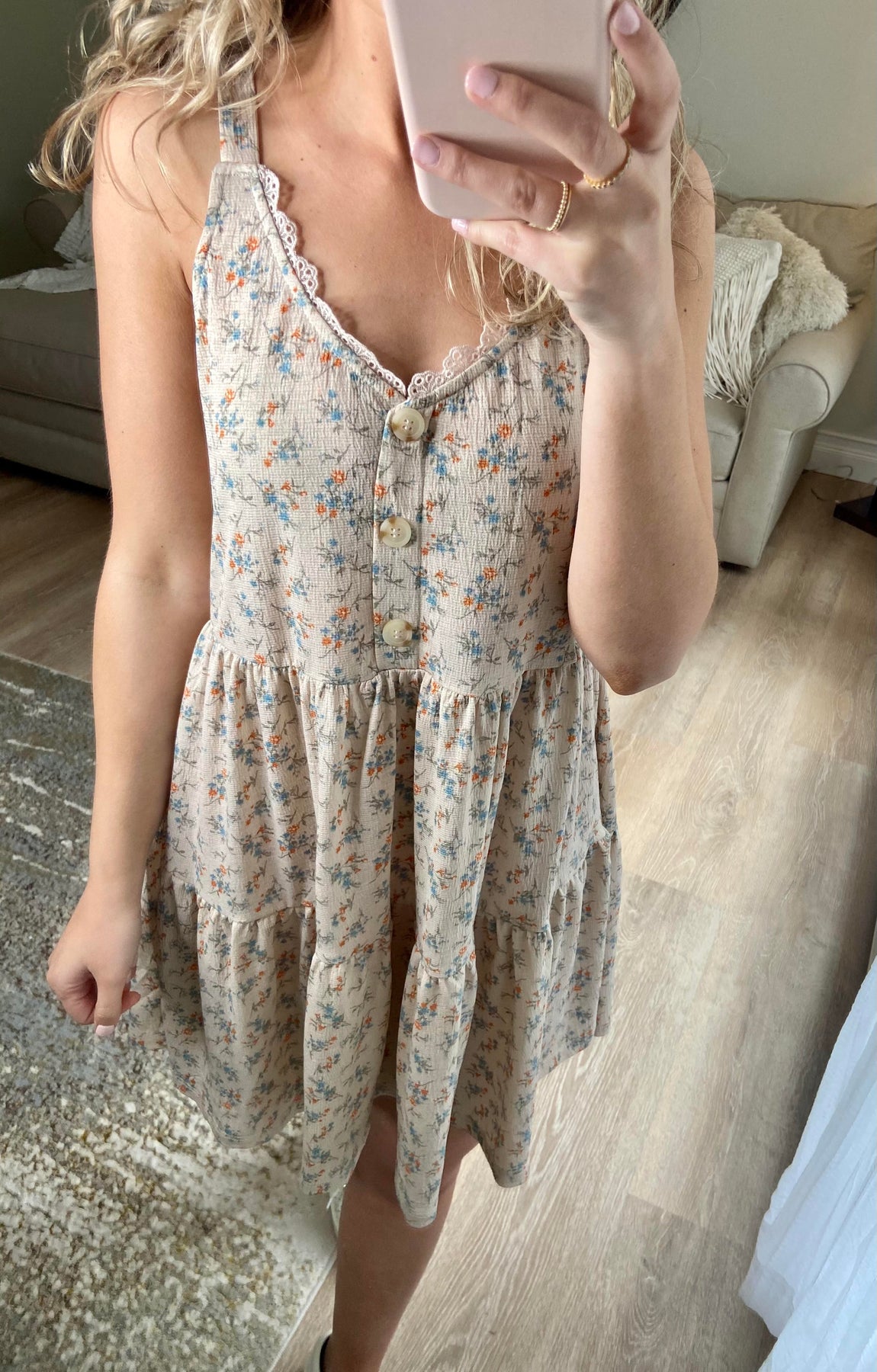 Floral knit dress featuring v-neckline, crochet lace trim, tiered body and mock button detail