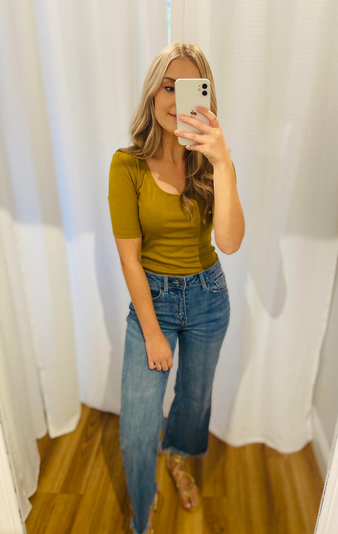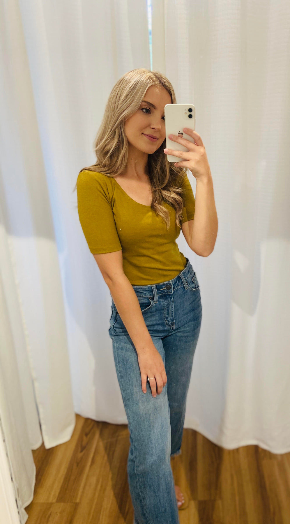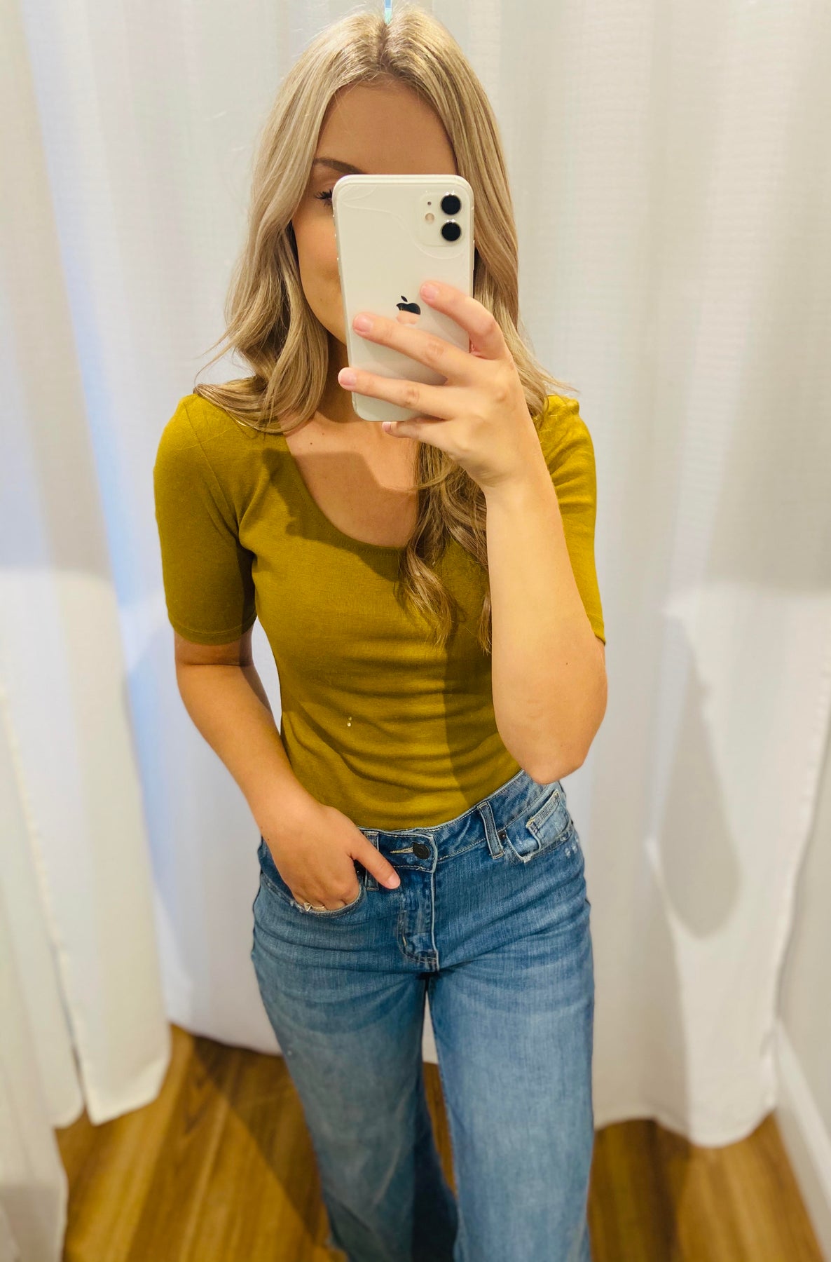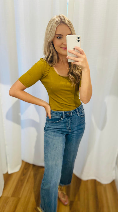 Lightweight scoop neck bodysuit featuring short sleeves and button closure