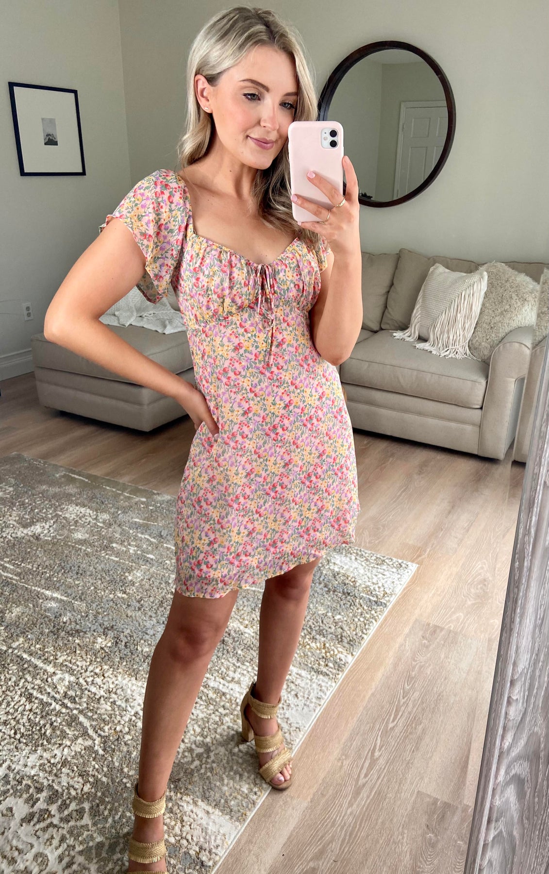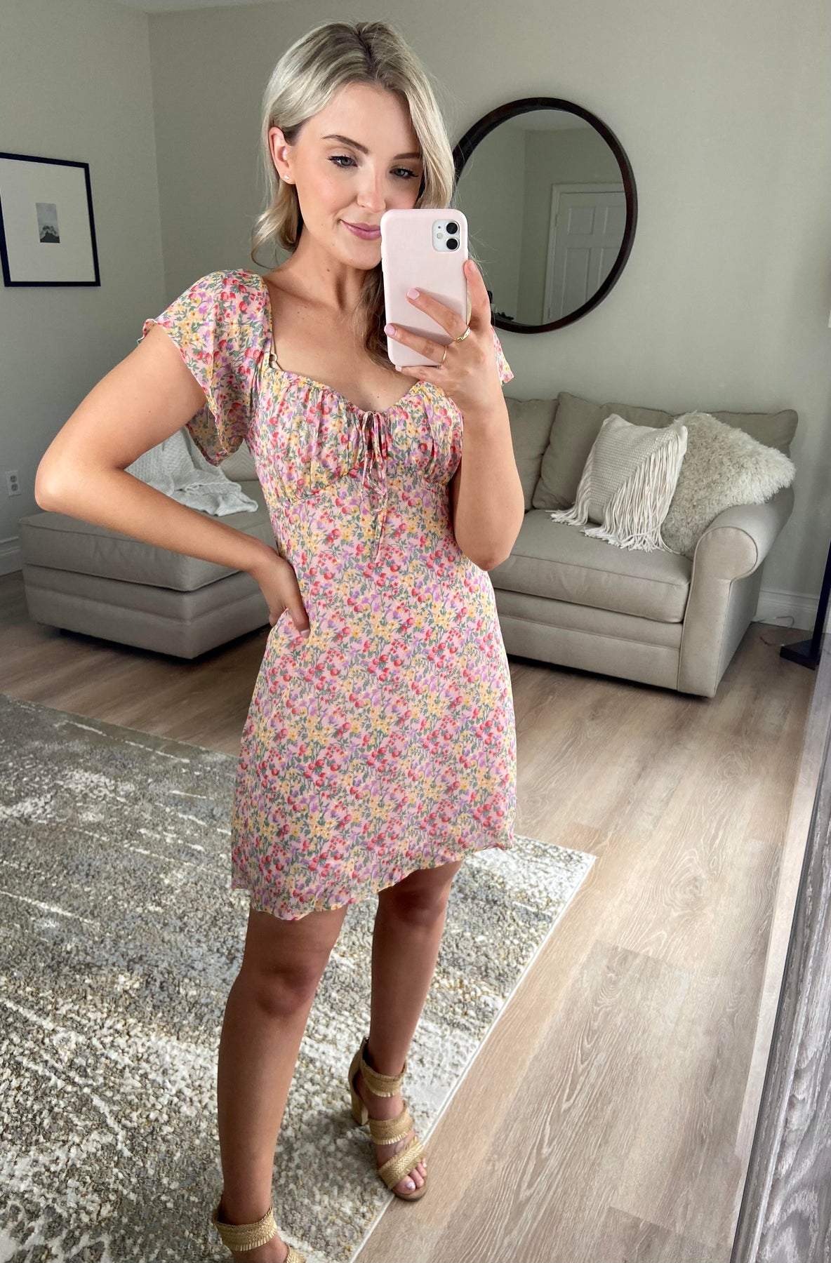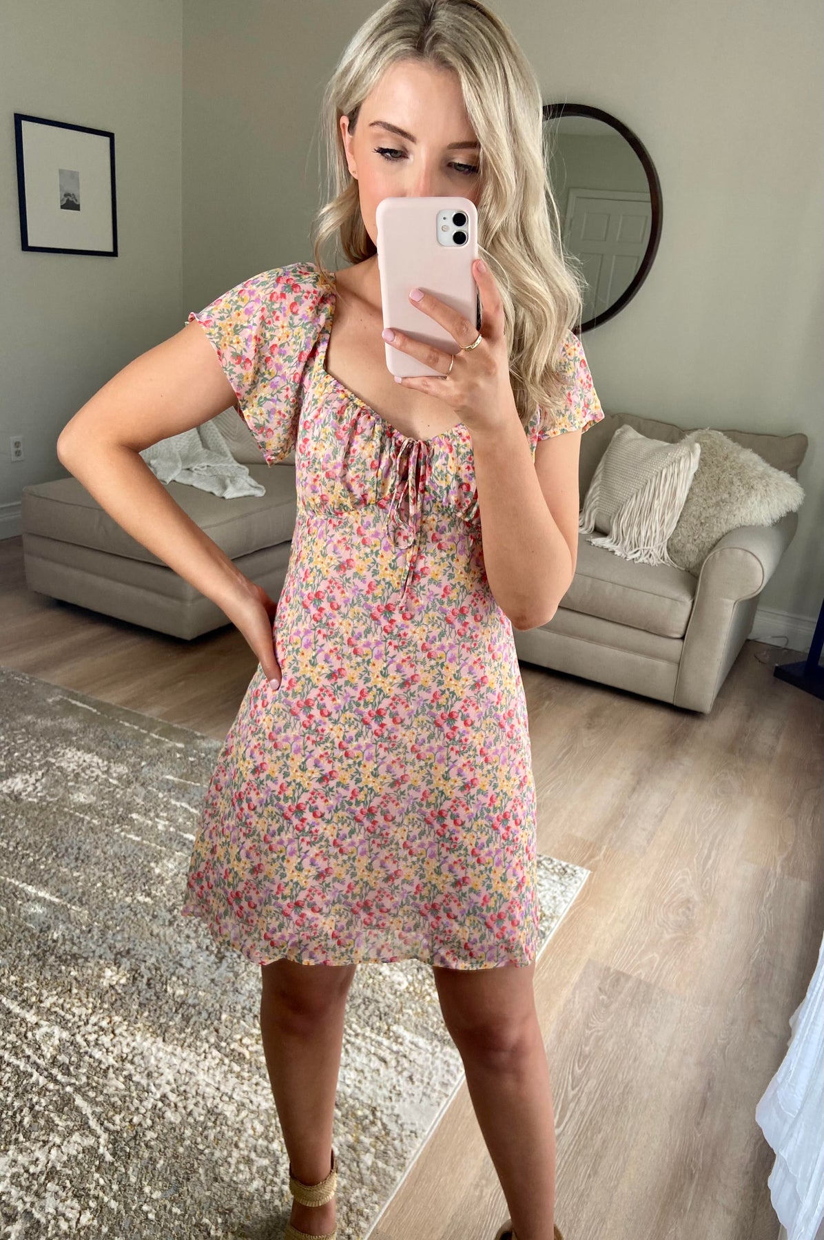 Mini floral dress featuring smocked chest with adjustable tie, back zipper closure, flutter sleeve and elastic trim detailing