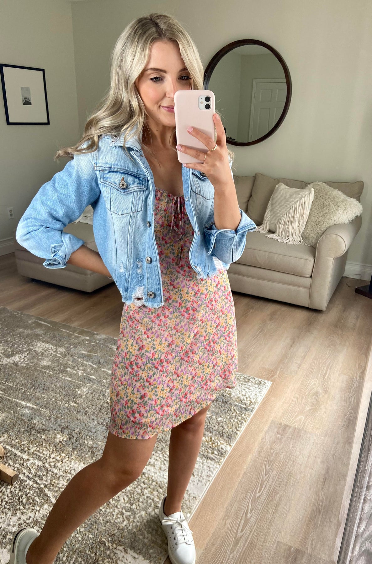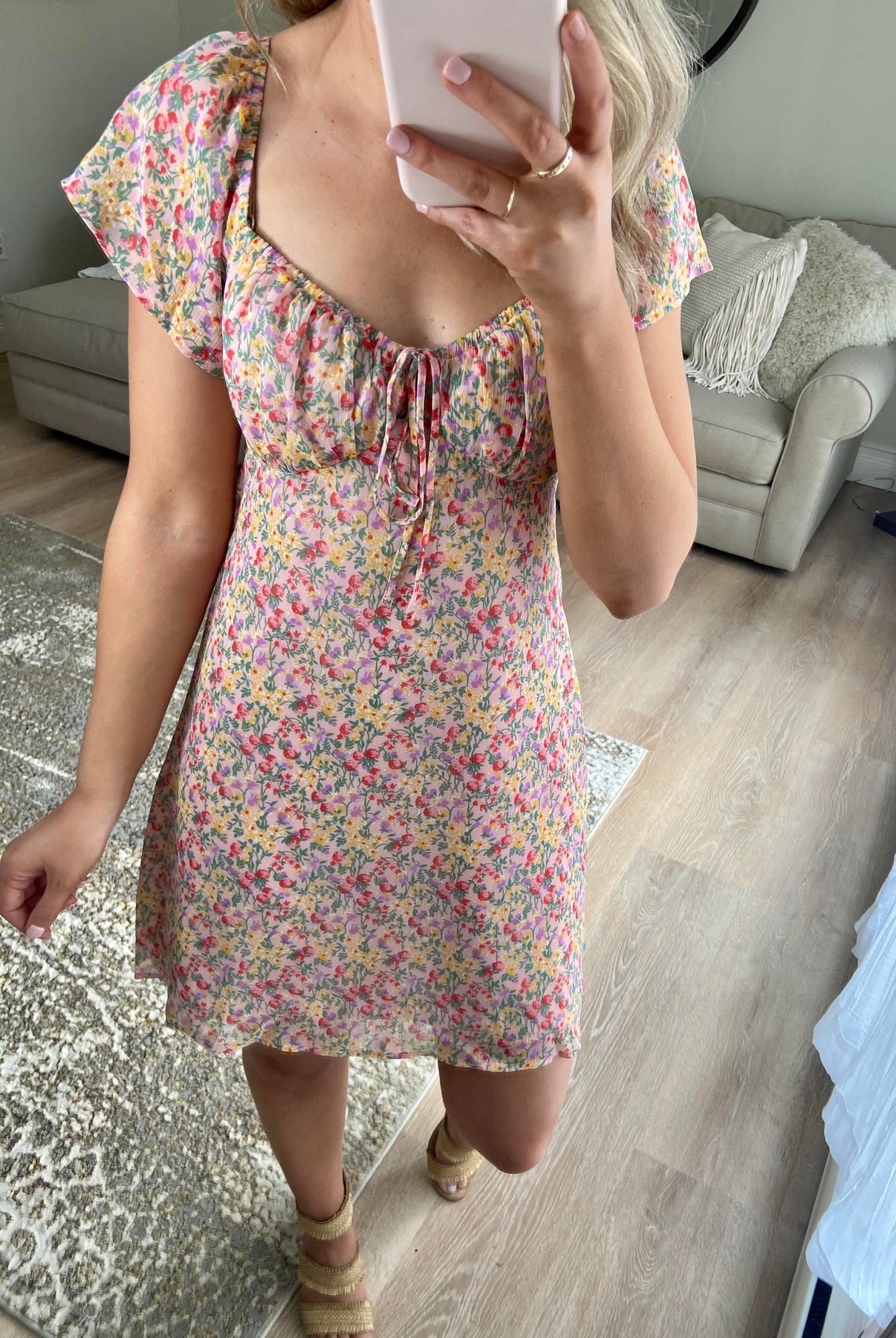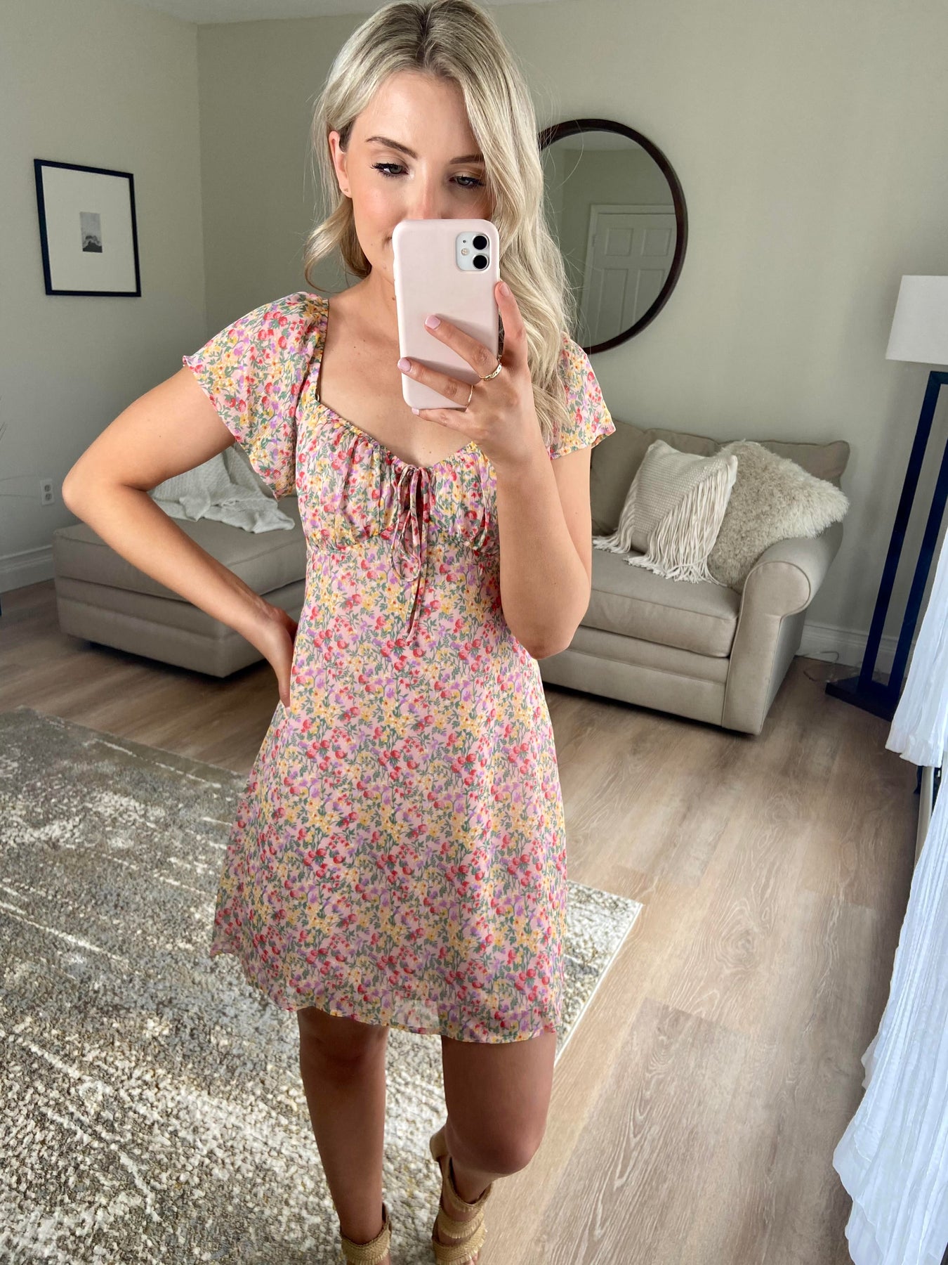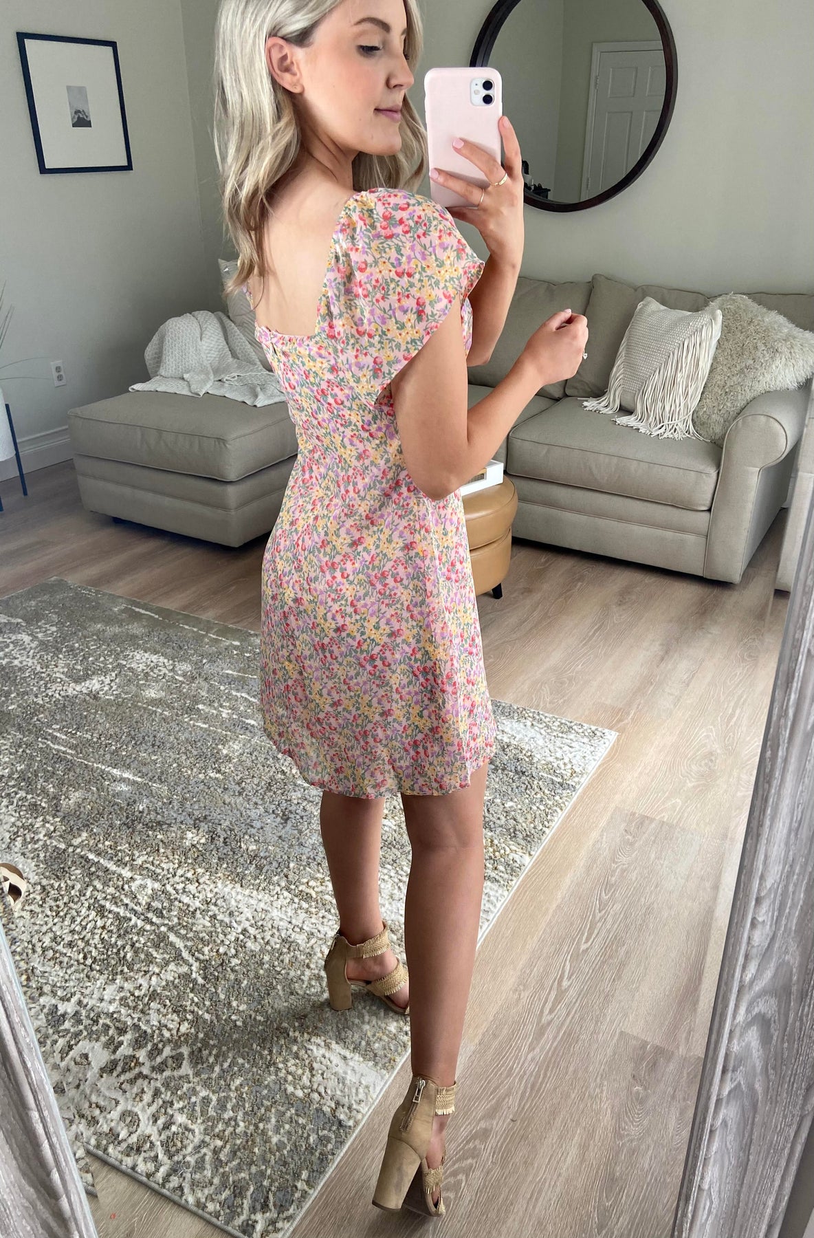 Mini floral dress featuring smocked chest with adjustable tie, back zipper closure, flutter sleeve and elastic trim detailing