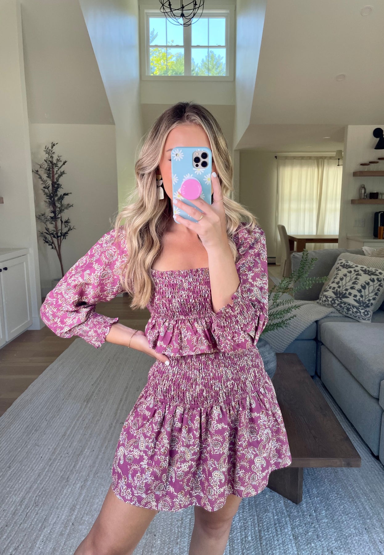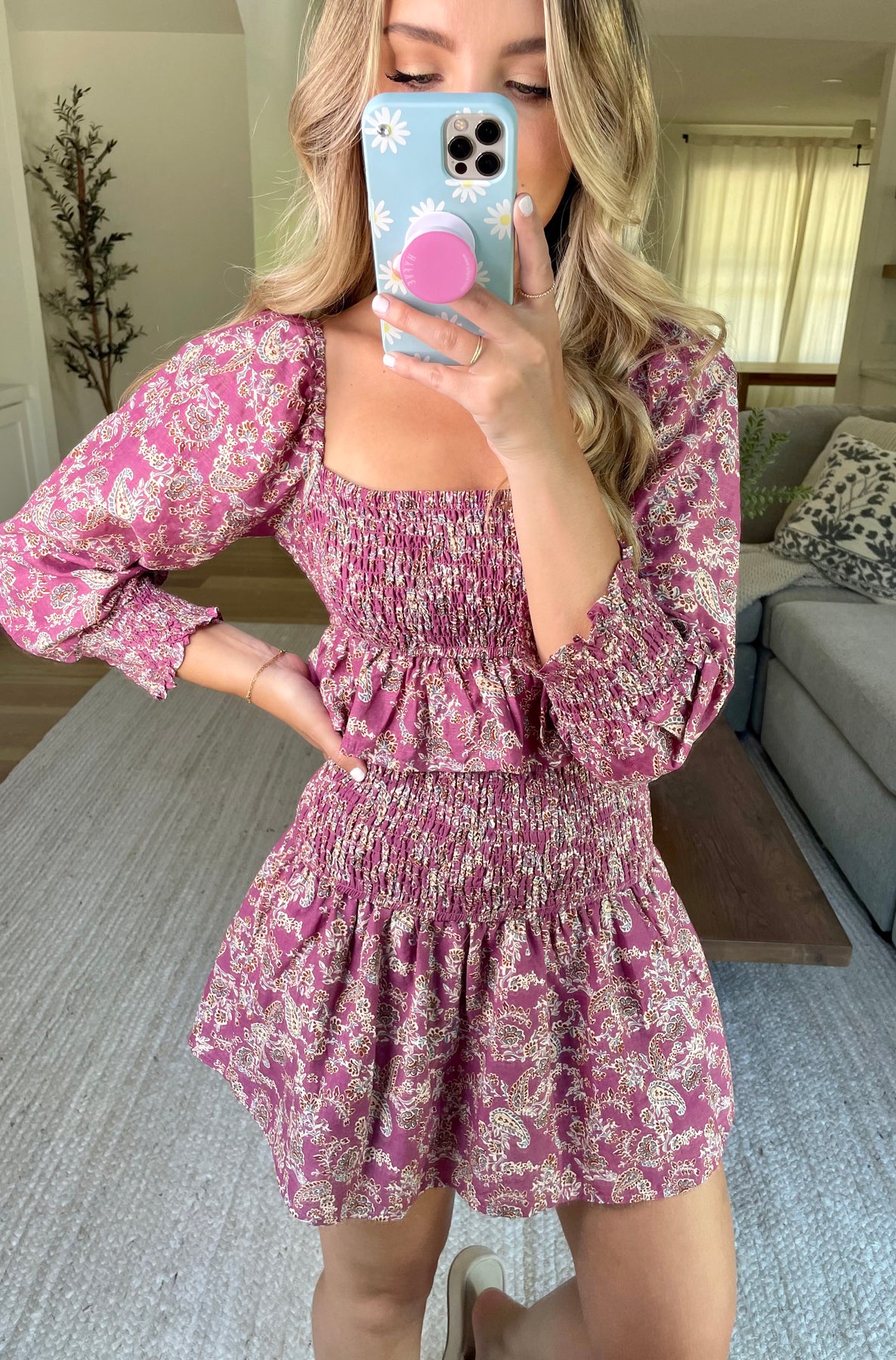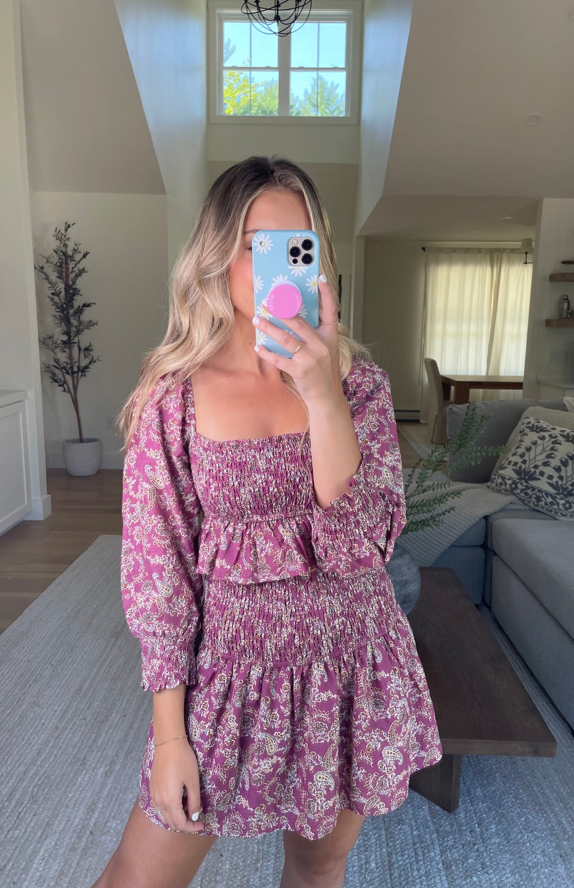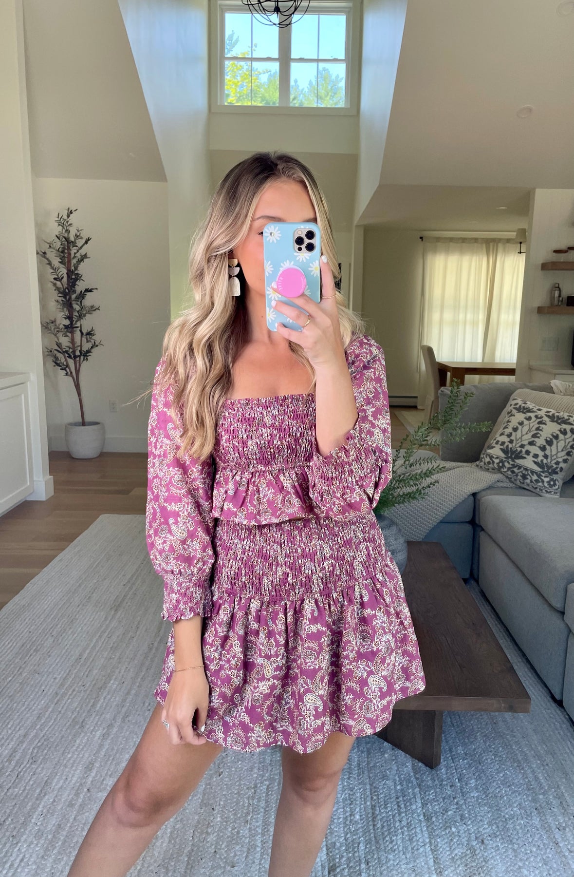 Two piece set featuring a smocked waist fully lined mini skirt, and smocked cropped long sleeve top with ruffle hem