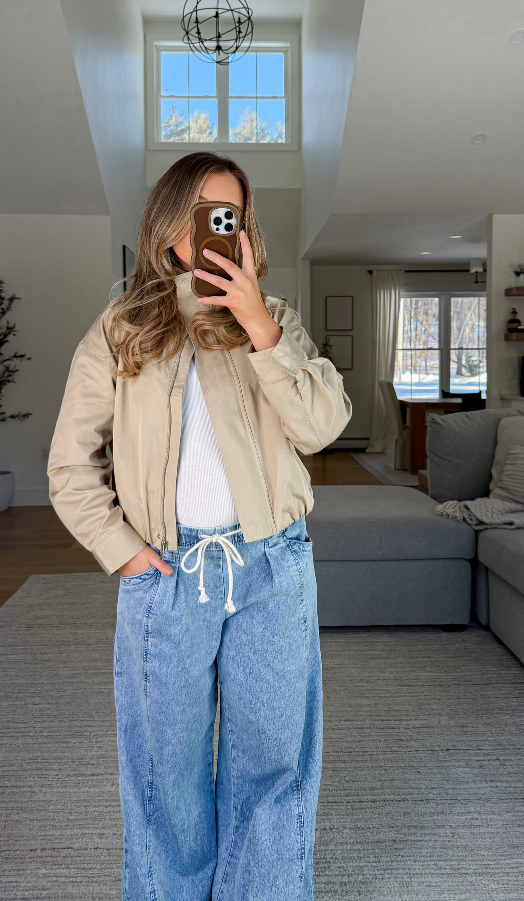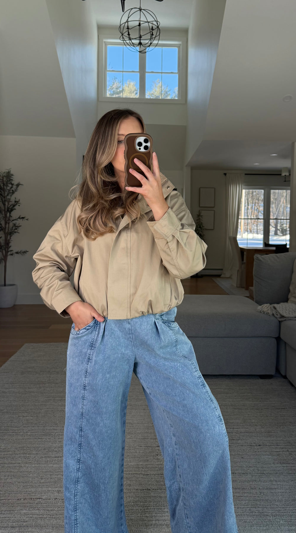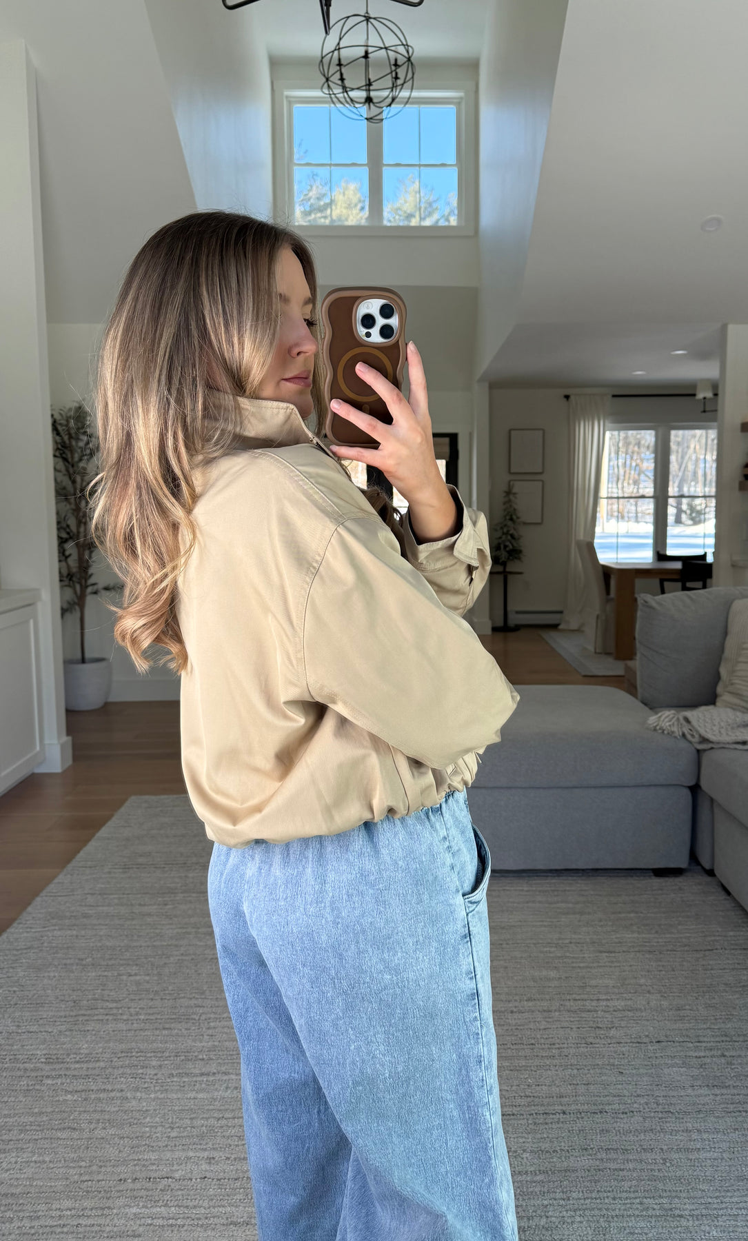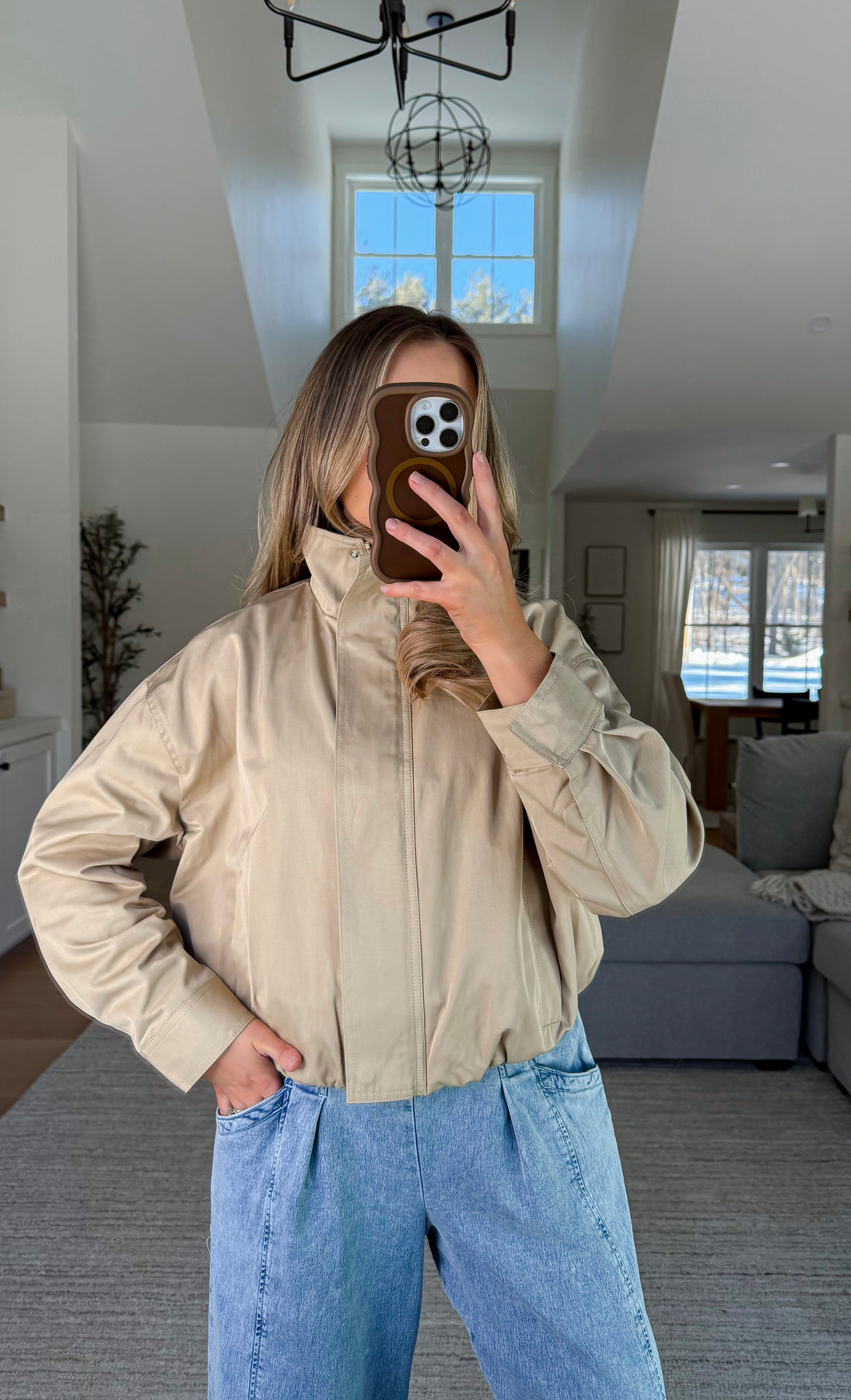 Bubble hem lightweight khaki jacket with hidden button detailing, side pockets, zipper closure, and mock neckline
