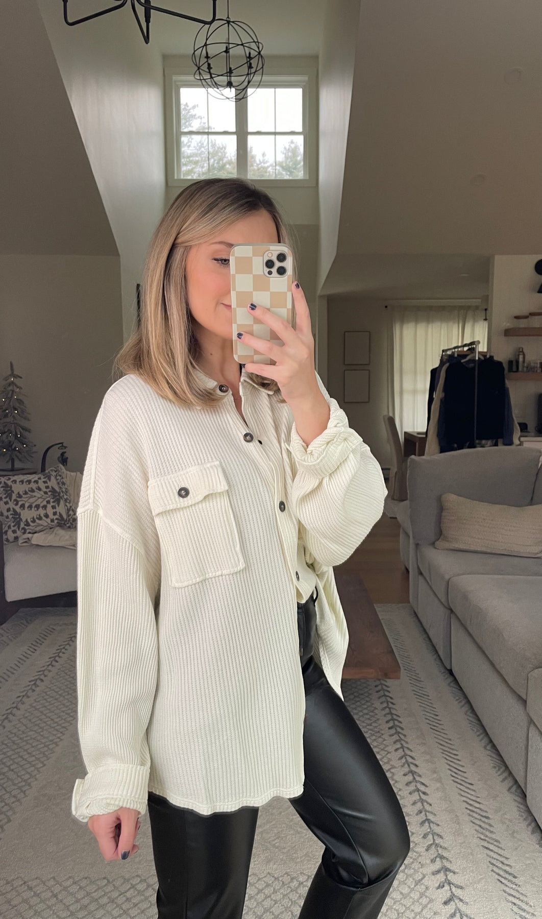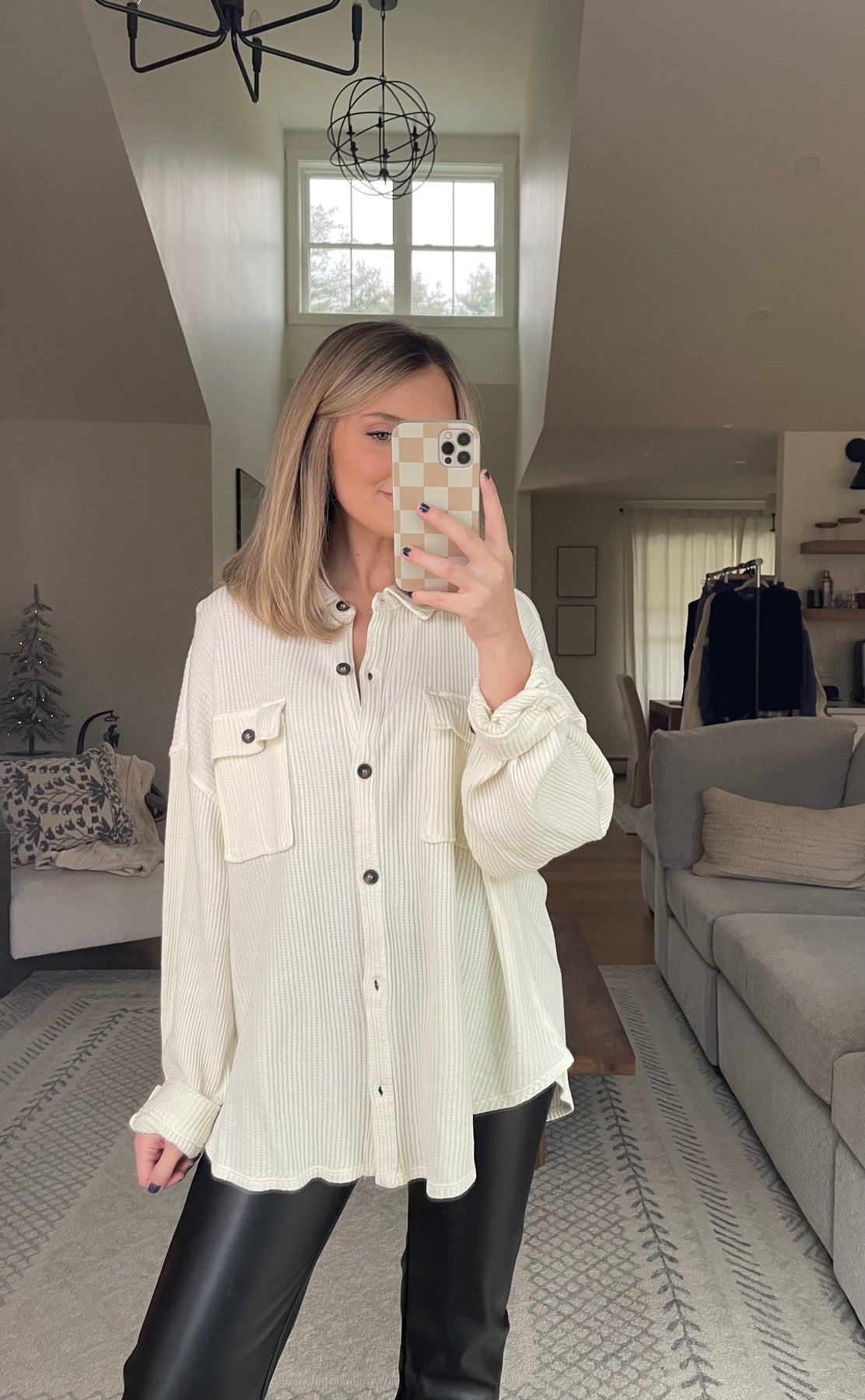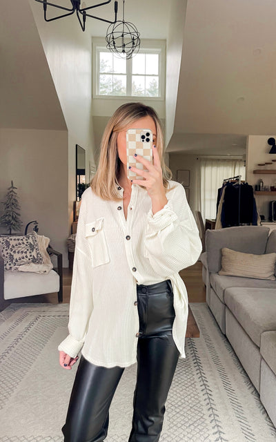 • Lightweight waffle knit button down top with front pocket detailing and an oversized fit