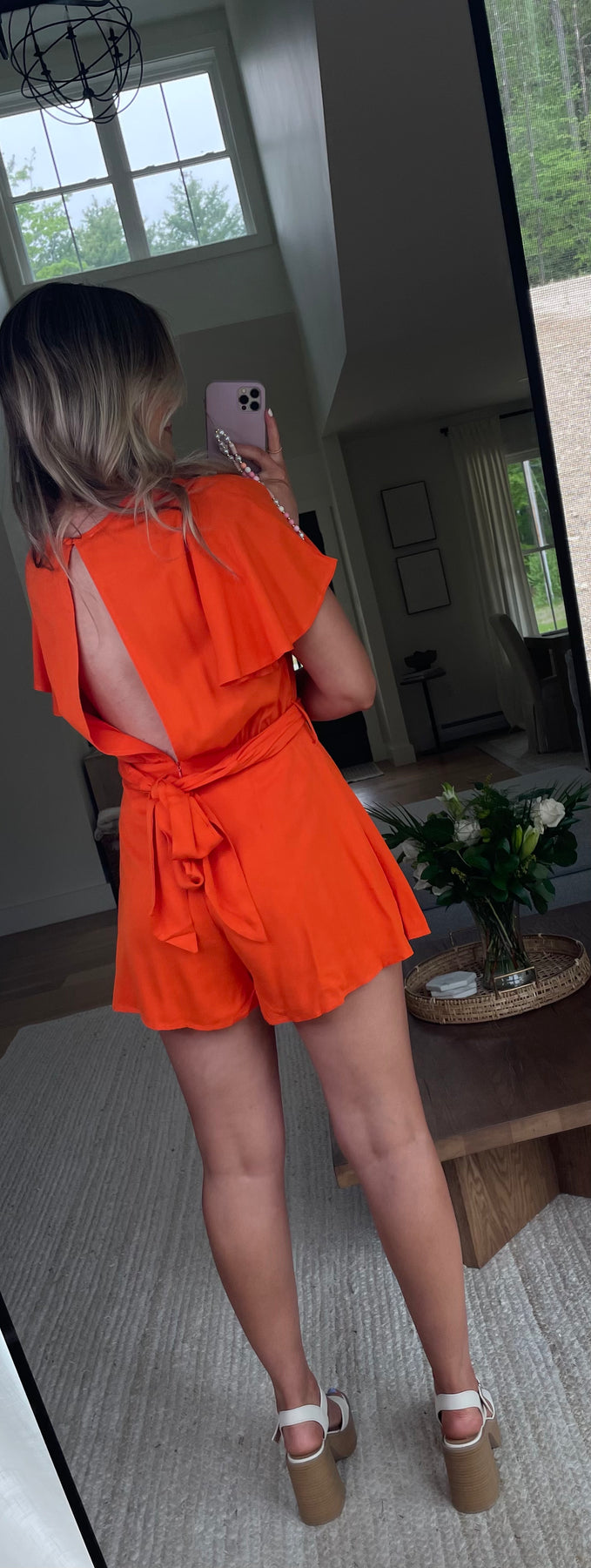 Deep v-neckline faux wrap style romper with keyhole back opening, functional waist tie, pockets and flutter sleeve